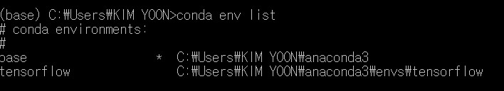 * ๊ฐ์ํ๊ฒฝ ๋ฆฌ์คํธ ํ์ธ (base) > conda env list