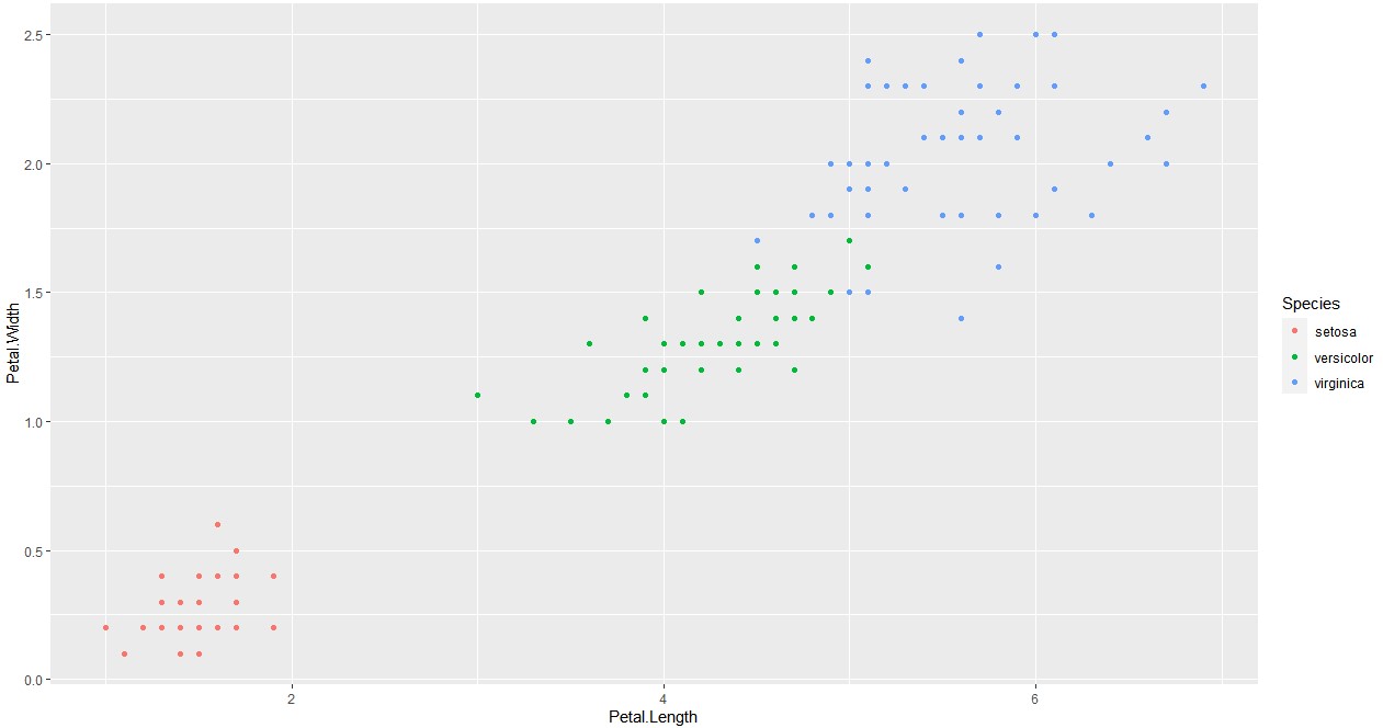 qplot(Petal.Length, Petal.Width, data = iris, color = Species)